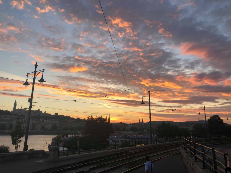 It took over an hour to get back (and we had to walk on a tiny strip of gravel next to a busy street), but we made it! We had an amazing dinner on our street again before heading out to watch the sunset by the water and see the Shoes on the Danube Memorial.