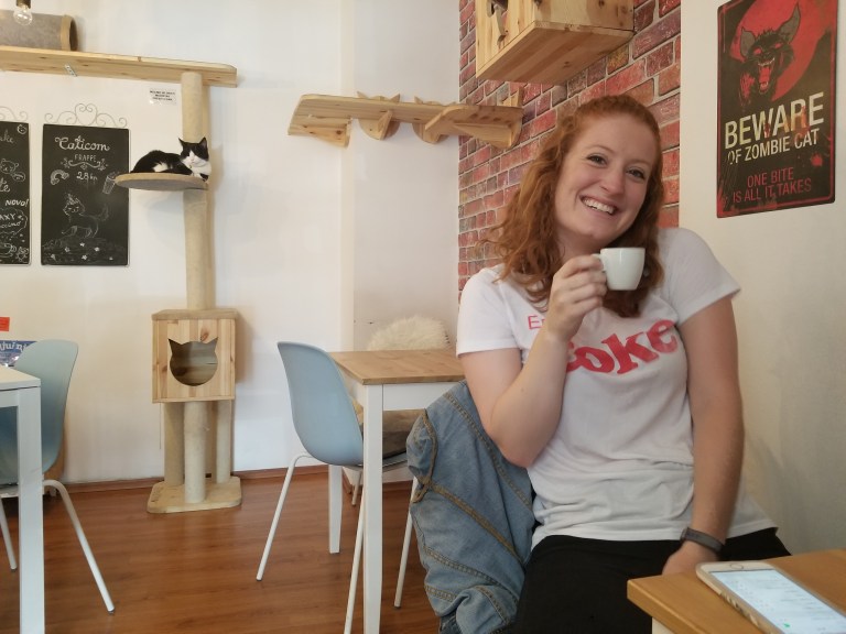 Our final morning in Zagreb we were able to sleep in a bit because our train was not until noon. However, check out was at 11, so we needed to find somewhere to spend time between check out and our train. Becca had read about a cat cafe and we realized it was just around the corner from our place, so after packing up we headed there.