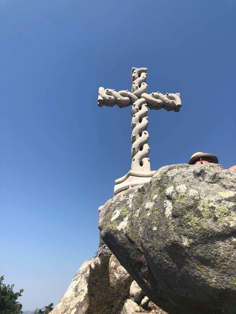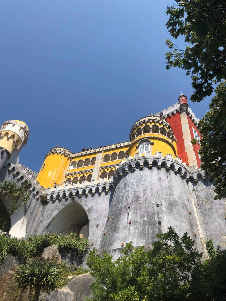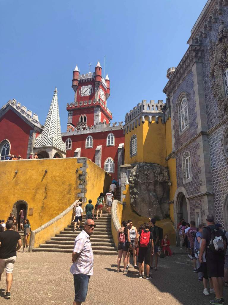 We finally made it to Pena Palace at the top of a huge hill and found 100s of tourists there too. Because we’d walked (and gotten lost a few times) it had taken us about an hour to get to the top and it was already 11 am – prime time for tourists to arrive. We had to wait in a massive line to buy tickets that wound around doubling back on itself and blocking the bus lane. We had to deal with the heat, the sheer number of people, and people cutting us in line. It wasn’t a happy time. But we finally made it to the front and bought our tickets… only to wait in two more long lines! One to get into the park complex and another to get into the castle itself.
