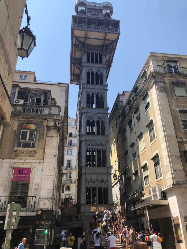 Refreshed, we set out for the Santa Justa Lift, a strange free-standing elevator tower by one of the main squares. We just wanted to look at it rather than ride in it, and we were shocked by the number of people waiting in line just for a ten second ride – a sign said it was about an hour and a half wait! It was neat to see though!